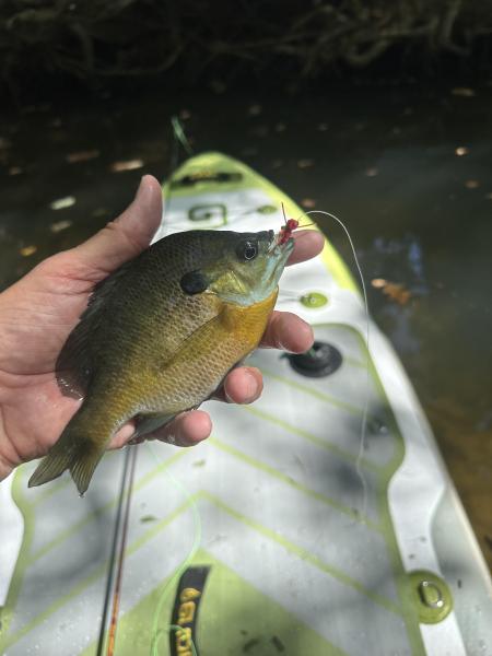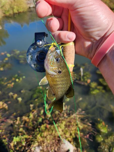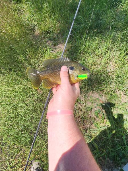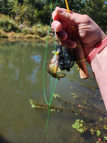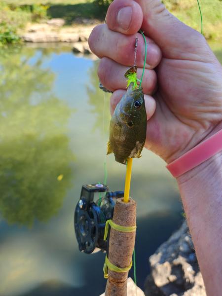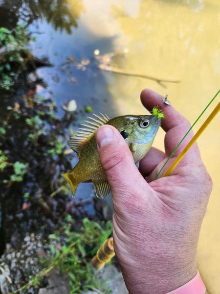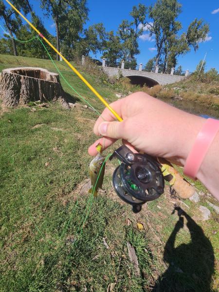 That's right. Forest Park has a stream that most wouldn't consider capable of being fished. I only caught green sunfish ans a couple times bluegill, but it was a great way to spend the day. The foam fly is one I tied and have had tremendous luck with. The spinner was just a fun creation that has done well. Literally a piece of stainless wire trying to mimic a mini rooster tail. The crick hopper is a temu special. I got a multi pack for less than a single at Walmart. I caught many more, but took pictures of these. I had a ton of snips, that I just coukd not get fast enough reaction time to set the hook. It got almost frustrating. LOL.8 points -