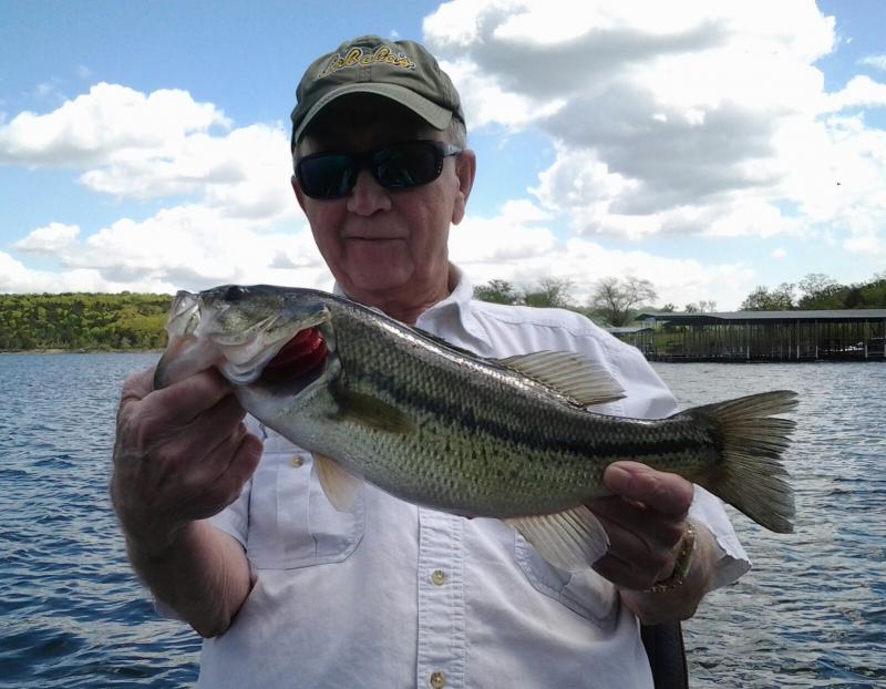 2. Gary and I fished up Sac river the last couple of trips and caught a ton of short fish. So... Tuesday we decided to fish the clear water on the other side of the lake to see if we could find some better fish. We put in at State Park around 11am. When we started it was completely overcast and dead calm. I was bound and determined to learn that Ned Rig bite and Gary was throwing a grub and a worm. We both caught several fish, even had doubles on a couple of times. About 2pm or so the clouds broke up and it got sunny and bright. The clear water bite slowed down considerably after that so we decided to head back up river. We were afraid it was going to be muddy but instead it was beautiful stained water, the wind picked up and we found 54.6* water. I immediately started getting bit on my crank bait and caught some real nice chunky large mouth bass. After about 20 minutes I caught a great big white bass on my crank bait so I decided to throw my little A-rig to see if there was anymore of them hanging around. I caught 5 more on the A-rig in about 7 or 8 casts.....then it got crazy. I would up catching 35 or 40 of those big, fat, sow whites in the next couple of hours. As the sun got low in the sky the large mouth started creaming the A-rig too.......My best day for numbers and quality of fish for quite some time....What a day.