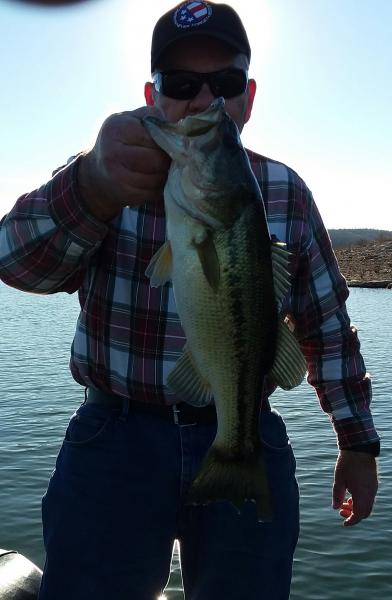 Had a birthday trip planned last Tuesday but had some medical issues that blocked me out..... Another opportunity today so I couldn't let it pass. My buddy Dean picked me up at 7am and we headed toward Shell Knob. Air temp was low 30's when we passed the bank at the shopping center and the water temp was 42.6 at the Campbell Point ramp. Water was crystal clear and dead calm and several pods of shad were visible on the surface as we eased down the hill from the care taker's shack. It was a brisk ride to say the least to the bluff end where Gary caught one on his first cast last year but after several attempt we had no takers. After moving two or three times in the first hour we finally started picking up a few on the ned rig. Last year Gary and I tore 'em up but they were mostly dinks. This year the bite was few and far between but Dean and I both wound up sticking a handful of really nice bass. Our best 5 would probably have gone close to 16 pounds. We both threw everything we had laid out on the deck but only got bit on the ned.....Happy Birthday to me....