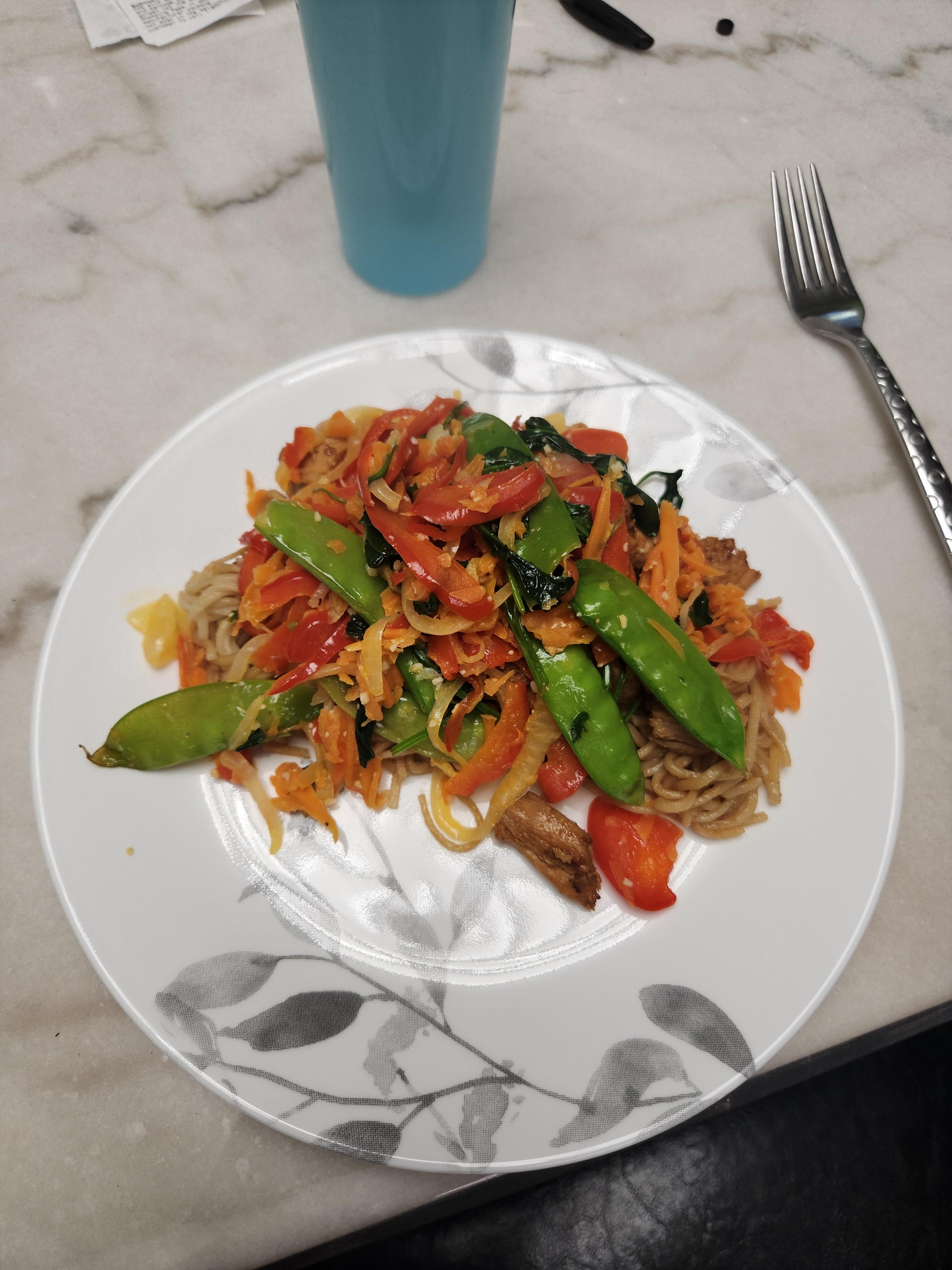 Sunday evening I tried something new. The wife hinted that she wanted some Lo Mein, I said, I'll give it a shot. It turned out well. My noodles to homeade sauce was off but it still tasted fine. Just need to double the sauce next time. I cubed the chicken breasts ( I prefer dark meat, but the wjmife doesn't) coated them in lemon pepper seasoning. Let them sit 15 or 20 minutes on the counter (This is a tried and true portion for my house.) Then I made the noodles per the package, get the ones that are for LoMein, not rice noodles. Found a sauce recipe on line, I think its simple teriyaki sauce homemade. I cooked the chicken in a skillet with approx 3/4 cup of teriyaki sauce from a bottle. Cook it over med high heat to cook down the juice in the chicken and the sauce. I cooked some veggies in a separate skillet, as the wife and kids won't eat them. Coat the noodles and serve.