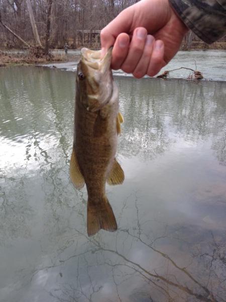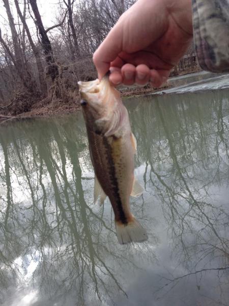 7. My first fish of 2016 finally arrived, at Meramec Springs today. As well as another 10 first fish of 2016. It was a feisty Rainbow probably in the 12-13" range. However, it continued thrashing and squirming around as I was trying to remove the roostertail from it, and in the process unhooked himself, and swam off before I could even take a picture. It would turn out to be my 2nd best fight of the day. So instead here's a pic of my 2nd fish of 2016. All in all got 5 Rainbows, 3 Rock Bass, 1 Brown Trout, 1 Smallmouth, and this Largemouth. Pretty fun day.