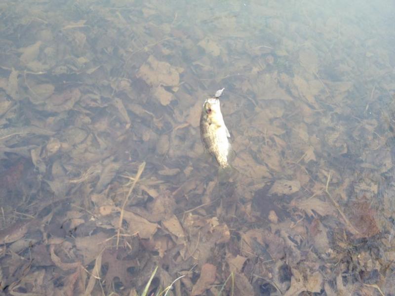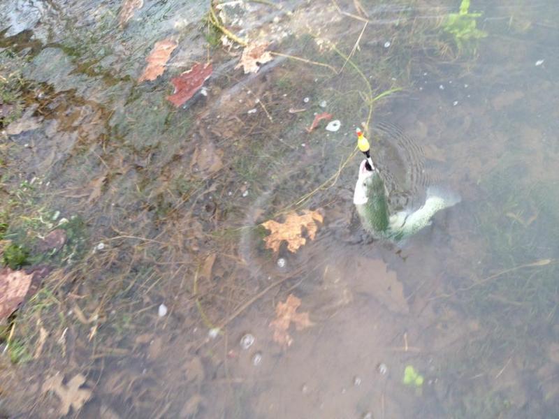 5. I was just about to make a report for today myself. What time were you there? And what areas did you fish? I thought the water was just mildly dingier from what it usually is. Seemed to work in my favor though. I started a bit after 11 and went until closing time. Started out a bit upstream of the fish cleaning station, Pretty much all day I was fishing roostertails on my 2 light action rods, a moth looking fly under a bobber (not on fly rod, just ultra light spinning outfit), and a black marabou jig under slip float on another ultra light. Actually wound up with 5 Rainbows, 3 Rockbass/Goggleeye, and 1 apiece of Brown Trout, Smallmouth, and Largemouth. Pretty fun day. The roostertails produced the best for me. Think I got 7 or 8 fish on them. Another 2 or 3 on the marabou jig, and just 1 on the "moth fly". Got my first one just downstream of where the little island is and the two stream arms meet back up. Was a 12" or so Rainbow on my best roostertail, a grey-black 1/24th or 1/16th one with silver spoon. Fought pretty good. I'd say it was my 2nd best fight of the day. Unfortunately it squirmed and thrashed around as I was trying to unhook it, and unhooked itself before I could take a picture. Don't want to bore people with too many details so I'll just say this, top 3 fighters were my biggest rainbow at 14" on a roostertail, along with the first fish of the day (the rainbow I already mentioned), and the smallmouth. The big rainbow fought like he was on steroids on the light action rod. Every time I'd think I got it tired out and close enough to net, it would take off on another run like crazy. It did that a good 6 or so times. I just kind of tried lowering the drag so it didn't unhook itself from the violent runs, and just kind of tried to ride it out. I'm really surprised it didn't get off, as much as it shook it's head, thrashed and ran and all. Turned out the hook was right in the top of the snout by the time I got it in. Being the genius I am, I only remembered that I had not took a picture of it, after it was already back in the water and out of my hands. But here's some pics of some of the others. Hey bkb, hope you don't mind me tagging my report along with yours.