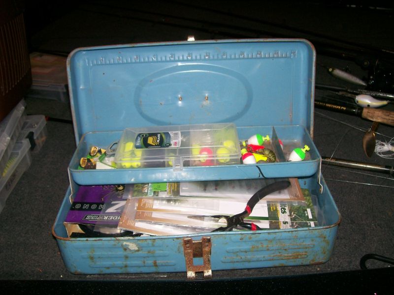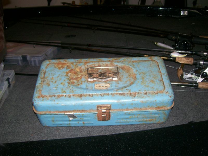 another forum I visit is discussing old metal tackle boxes. I am sure a lot of you folks have some. Here is one I still use. This was my first, very own, tackle box, vintage early 1960's. I must have been 5 yrs old or so, I even wrote my name inside of it as you can see on one of the following photos. I still use it to store my winter trout fishing stuff and micro jigs for wade fishing. That is a 12 inch scale stamped on the top. The faded sticker on the lid says something like Pinitin??? in faded blue letters and Model No. 4313.