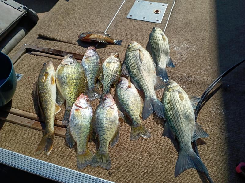 Caught some too. Been itching to go lately but haven't had a calm, free, and reasonably warm day until now, although it was a little breezier than I prefer. Very few boats out, now is the time to go. Water temps were 45 or so. Real clear, and higher than I'd expect for this time of year. Crappie were where you'd typically find them, deep main lake structure, mouths of coves. Good size too, no short fish. Some whites mixed in with them, also good sized, I threw several of those back. I used #3 jigging raps and jigs today, nothing else. I also caught this literal spotted bass, never seen one like it. Probably between 3 and 4lbs.