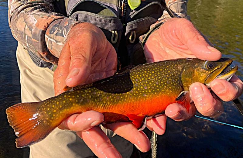 Had a good morning with lots of rainbows, 4 brookies and 1 average size brown. I hooked this nice male rainbow in 1 foot of water and had quite a time getting him into the net on 6x tippet. At one point he ran under a downed tree and I could see him on the other side. I kept steady pressure on him and finally worked the line from under the tree and got him out. He hit a size 14 scud. Also caught a few on a crackleback and some on egg patterns. Here is the rainbow and a pretty male brookie...