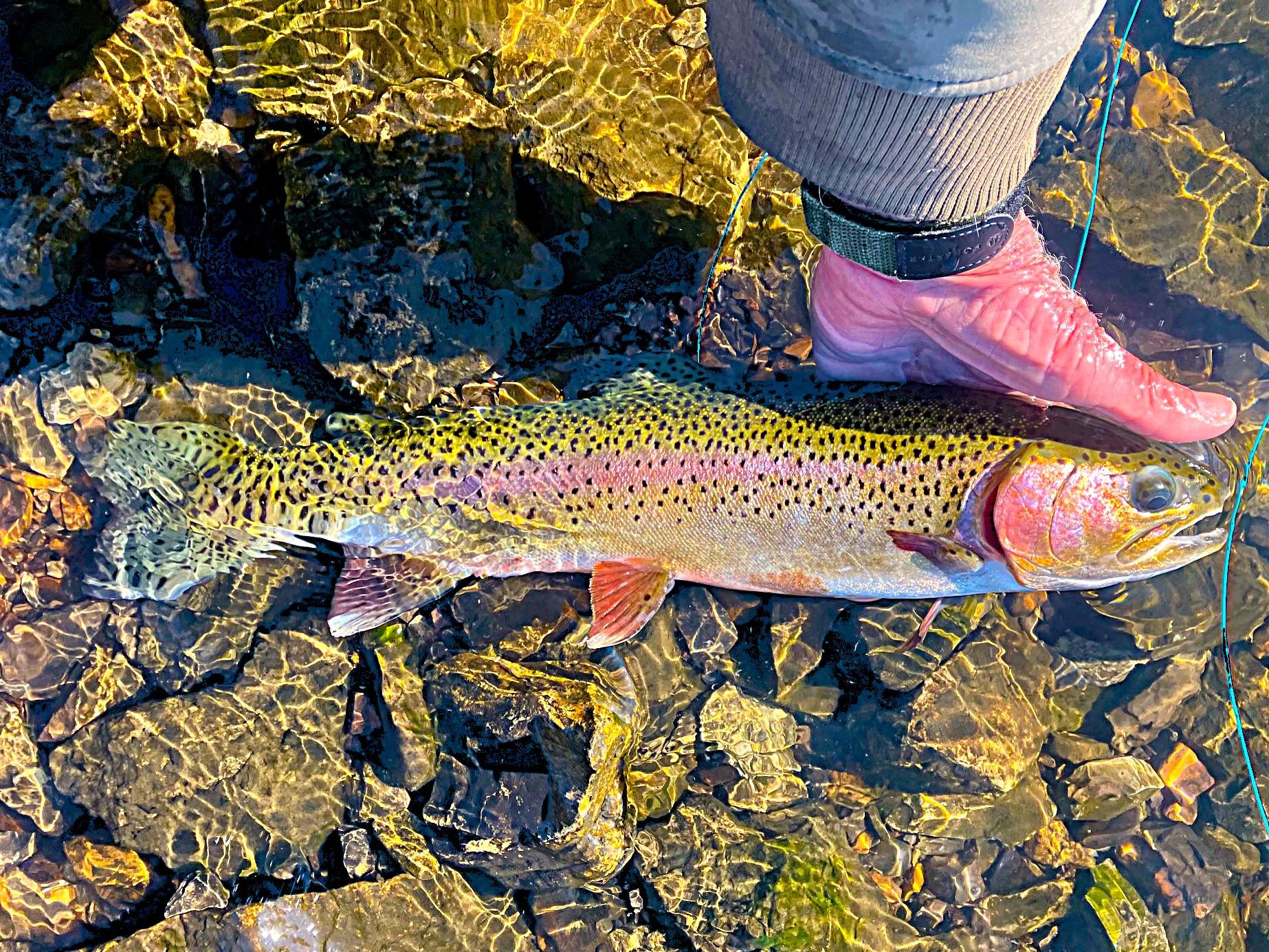 SWPA has been running water in the mornings this week, so I made a trip to Three Chutes this afternoon after the water went down. Fishing was good with lots of rainbows, 2 browns and 1 cuttie. Best flies were a size 14 scud and a size 16 egg pattern under an indicator. Here is the best one today on the scud.