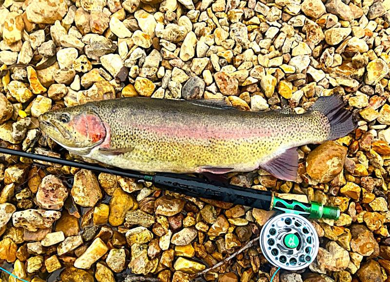 Fishing has been good since the C&R area reopened on the first of February. LOTS of guide boats out, but most of them leave when the water comes down and that was the case this morning. It is sort of like the changing of the guards as the boats leave, the wade fishermen arrive. I got there around 11:00 when the water shut off and had a good day. Best flies today were eggs and an olive/brown micro jig. Caught lots of rainbows, 1 cuttie and a few browns. Here are a couple of the better ones.