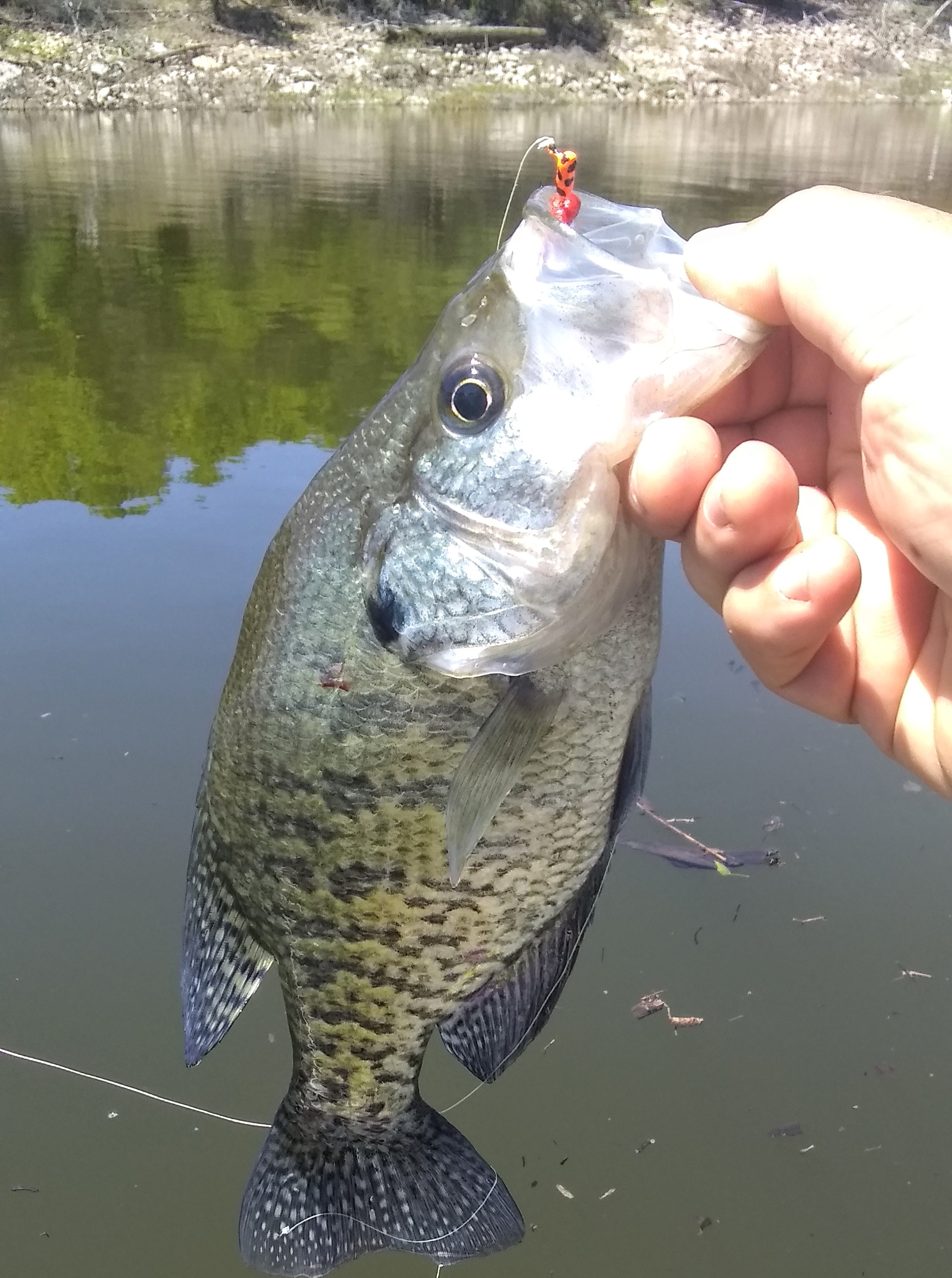 Fished from 9-5 WT 65 2' visibility 3-7' Took the boat and crappie fished all day ,didn't even bring a bass rod. Caught 52. I get more bites tipping my jigs with Sparkle Nibbles. The nibbles also cover the hook and help prevent snagging. Fished the same bank all dam day. Early bite they chased the jigs. Put the boat in 12'+ and cast towards the bank. Once the sun got high,even with the overcast, you had to go vertical into the brush after them. I must have measured 30 fish today. Lots of shorts ,but went home with 13. I want to tell everyone about a bass I caught today. He had the biggest hole in the side of his mouth. I could have put my pinky finger through it. It was a hook hole. Obviously the person who caught it before me had no clue how to remove a hook without destroying the fish's face. It was a nasty sore, pus covered and red. It's amazing how bass can tolerate the stress of the spawn and people ripping holes in their face. It was a 13" largemouth. My crappie jig was barely skin hooked in the upper lip. Very simple removal. There so much emphasis on catching fish, but there also needs to be a lesson on hook removal π because some people are terrible at it. They must think making the hole bigger makes the hook come out easier .