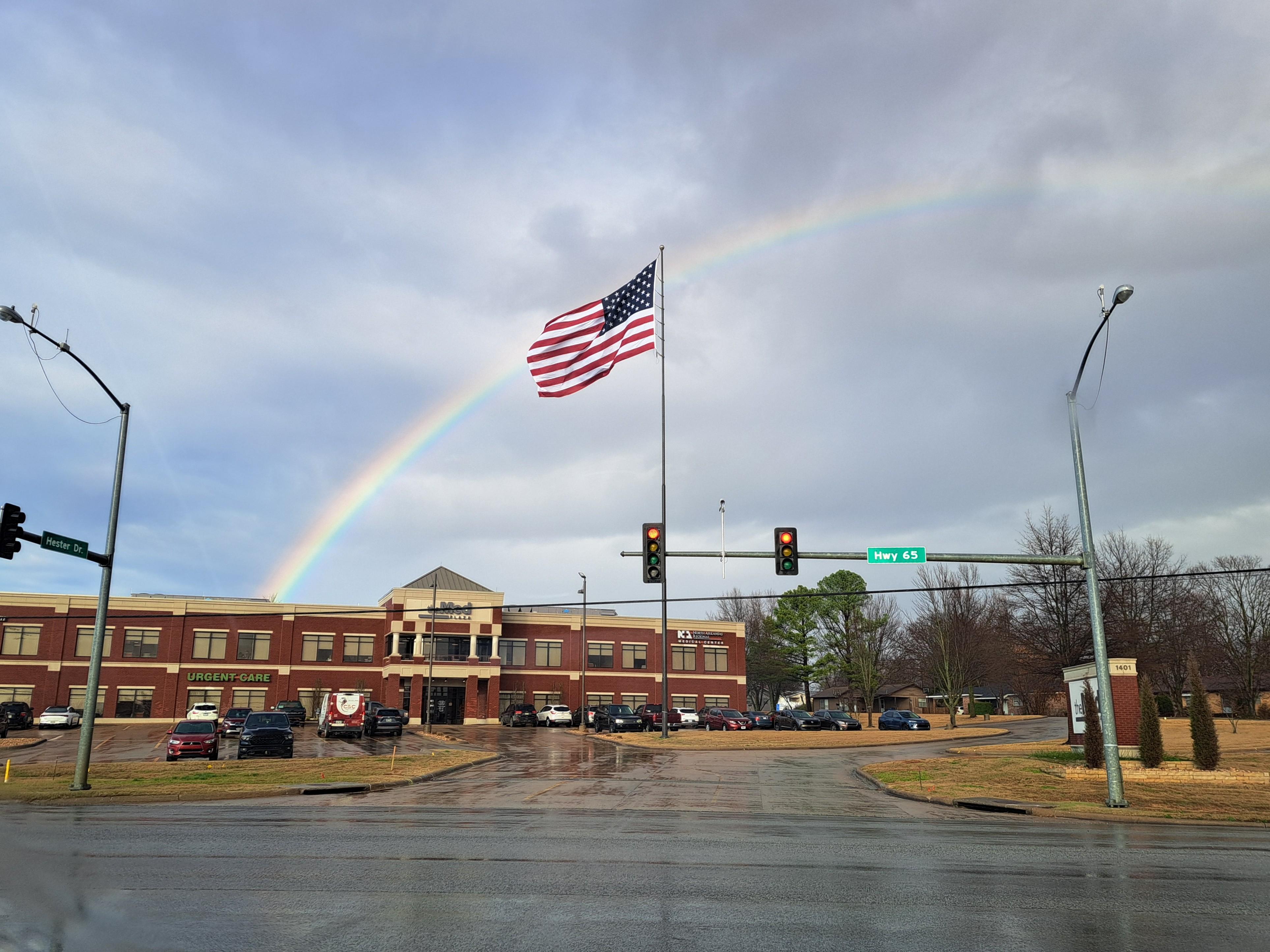 After the shower in Harrison today we had a rainbow that went all across the sky. I thought this was real nice with the flag in foreground. Both are inspiring. One reminds us we have a great God. The other we are fortunate to live in a great country.
