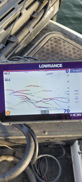 I fished this morning and landed on a good group of fish that lasted all morning. I could see fish somewhere around the boat all morning. There was shad in the area but not a ton. Also lots of trees, but the fish do not hug the trees during the first couple of hours because they are constantly moving. When 9am rolls around they start hanging around the trees. The last time out I used a 7/8 spoon and 5/8 jig head with a jerk minnow bait, so I started with those baits and quickly realized they were not working. I ended up using 3 different jig sizes (1/4, 3/8 & 1/2 oz) with each having a 2.8 Keitech. My favorite was the 1/2 oz and it was very productive because of its efficient drop speed in deepwater. I kept the boat in 40-50 FOW and would pitch the 1/2 oz SB to groups of fish that were postured near the bottom, then just reel the SB straight up thru the fish and they liked the bait moving upwards. Sometimes they would react better if I speeded up my retrieve. I did not catch many deep fish using a horizontal retrieve. There was also some surface fish chasing small pods of shad and I was able to catch a few with the 1/4oz SB. Caught plenty of fish and most were K's with a few LM & SM in the mix. I alternated between 2D & FFS and each technology works great for deep winter fish that are grouped up. I attached a 2D picture and I could have taken dozens of 2D pictures showing groups of fish under the trolling motor. WT 52.5 - 53