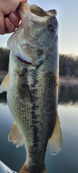 With all the cold weather it has been a while since getting on the water. I did not know what to expect this morning but I was pleasantly surprised with what the fish were doing. I started on the main lake in 80ft with trees and limited shad. I found some suspended fish schooled up in 80ft (down about 50ft) but they were near impossible to catch with a vertical presentation. Then I noticed some loons working a stretch of bank with visible trees and the best trees were setting in 20-35ft. So I positioned my boat in 35ft and cast to the trees with a 2.8 Keitech and the fish were postured very near the surface. There were several LM in these trees and I would let the SB drop about 5-10ft down. These fish were postured just right for a jerkbait but I stayed with the SB. For me, the jerkbait is too time consuming --- you have to be extremely careful in unhooking the fish & net, so you waste a lot of valuable time in the short bite window. I did not see fish using the 20-35 FOW range prior to the extened cold snap. With the lake being down at least 6ft, I thought the fish would just stay over deep water. Caught about 10 keeper LM and several nice K's. I was around a lot of fish between 7-8:30AM, then by 9AM it was looking pretty empty. WT 45.3 to 45.6