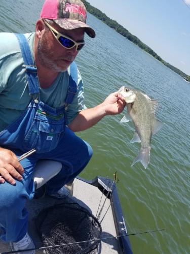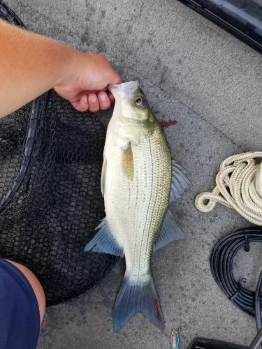 Dad and I had a 50 combined fish day. Found a mega school on a bridge piling and caught 40 off small spoons. Wakes and wind moved shad up towards the surface and bass were periodically busting like crazy. 75% spotted bass between 10 and 14 inches with some whites and largemouth mixed in. Had 6 keepers including 3 white bass over 2.2 lbs. Very lucky to be in the right spot at the right time today. I only caught 1 prior to fishing the bridge this afternoon.
