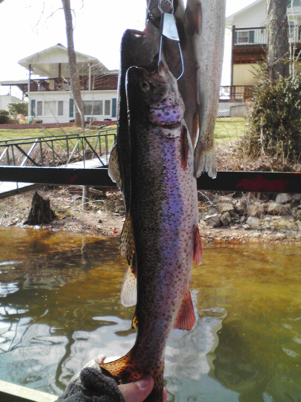 4. Well, I thought I'd add another fishing report to the list of many on the forums tonight. Several guys and I fished both Saturday and Sunday morning, starting relatively early both days and just did great. We heard from another friend already fishing that the bite was good on Little Cleo's so we stocked up. As I have said in my past posts, I am a bass guy deep down, so this was great news!! Let's just say that there was no shortage of great fishing both days. Saturday we boated most of the way to the dam. The wind and strong current made it "fun" controlling the boat, but we managed to catch 20-30 rainbows between the three of us on the drift back to Fall Creek. We fished mostly with our Little Cleo's, catching all of them on a bronze with red stripe. Stocked up at lunch and headed down the lake to the bridges, stopped next to some docks and procedeed to have a blast catching and releasing a mess between 10-14 inches. Returned to the bridges Sunday morning with our other boat and brought in another limit. Thanks guys, for all the advice leading up to our trip, Taney was definitely worth it this weekend!!!