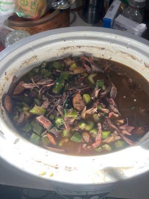 Hey Ryan, I will do a pot of gumbo (sorry DJ but I use bacon grease in my roux) but have some shredded wild turkey meat I can share that has been smoked, but cannot guarantee it did not get some drippings from pork butt when I smoked it though????? Just let me know.