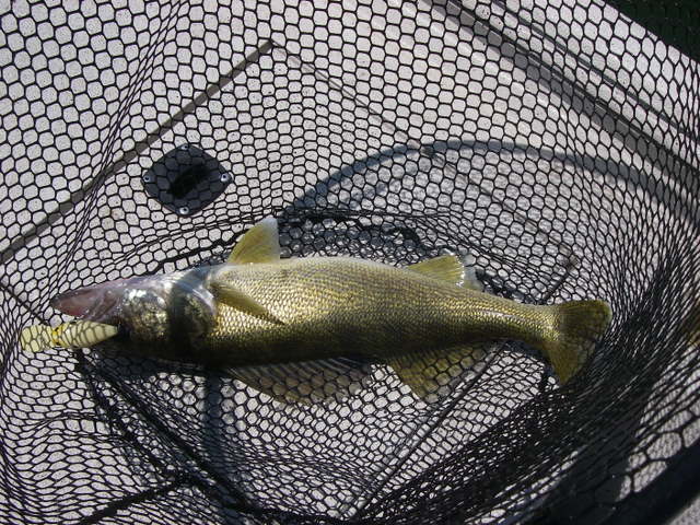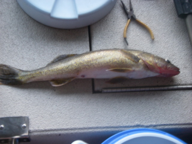 After summer school let out, I decided to try to find walleye. I trolled around four hours. I caught two walleye, one of which went 19 inches. The other was an almost legal fish. Both hit a bone wiggle wart at 18 - 19 feet. One came from an inside bend flat edge. The other was cozied up to submerged trees in 27 feet of water. I marked deeper fish but could not persuade them to bite. I saw one other walleye caught and asked the depth. The man answered 15 to 17 feet, he thought. The keeper I caught was a skinny male (see picture). I hope I find the larger fish soon.