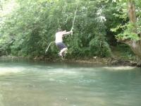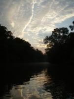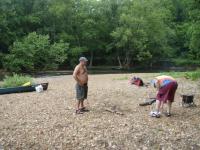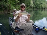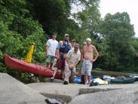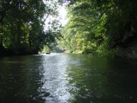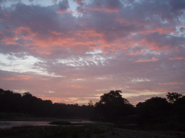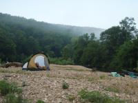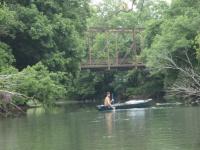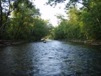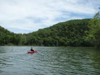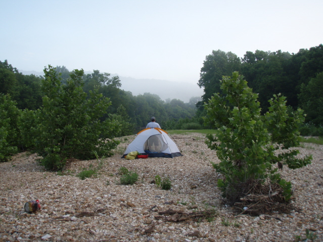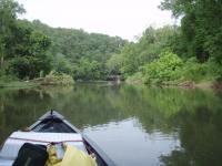 Our trip was June 11-14th starting at the low water bridge at McDowell. We floated 3-4 miles to some point upstream of Stubblefield access the first night. This was the area where we caught several crappie as well as lots of bass. We woke up to a beautiful sunrise that would signal the start of a great day. At some point a few miles downstream there was a bluff that was absolutely covered in growth thanks to the numerous waterfalls seeping out between the rocks. Camp the second night was in the national forest stretch I believe (between 39 and EE). We woke up to a heavy fog that was as slow to rise as we were on this Sunday morning. We ate a HUGE breakfast of 24 eggs, 2 pounds of sausage, 4 peppers, 2 onions and a bunch of greens. We did finally get going and headed out for highway EE bridge where we would be losing three members of the party. This stretch is pretty shallow, but we still managed to catch lots of little fish, including a nice catfish that would be part of Sunday night dinner. Once we departed from highway EE bridge we were down to the three buddies that have been hanging out since high school. At some point in the afternoon we digressed to our youth and put away the poles in favor of a few of the numerous rope swings (I swear there is one on every bend of this stretch of river). After this, the river starts to pick up speed and current as it plunges faster towards the old James River. We camped just a few miles above the start of flat water for the night and had a dinner of beans and greens with catfish and goggleye. We hung out all morning the next morning after another huge egg breakfast and joked about old times until the storm clouds started gathering. We had been worried about flooding the whole trip, but now we weren't worried because we were close to the lake. We should have hurried a little more. We fished our way into the lake I managed a nice little walleye right before our own private hell started, at least for the two of us in canoes. The wind started to pick up right as the lake widened and our progress was limited to a crawl while expending huge amounts of energy just to keep the boat heading into the wind. The two of us watched the kayak disappear around the final turn as we tying together to battle the wind in tandem (at least we would have a paddle in the water on both sides!). We did finally make it to the dock at the Flat Creek Grill and headed up to have a burger. That tasted great after 4 days of beans, greens and fish. Once we loaded two canoes a kayak and all our gear in the (short) bed of pickup we made our way (slowly) back to the put in to see if the shuttle car was still there after 4 days. Thankfully it was fine.