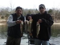 I apologize for not posting sooner, and with yesterday's cold front, I am sure this info is out-of-date. I would assume as soon as we start warming up again, this pattern will be repeated. Area: James River in vicinity of Cape Fair Water Temps: 50-52 degress Air Temps: 59-71 degrees Wind: S and SW 5-15 MPH with gusts to 20 MPH hitting the bank Sky: Mostly Cloudy Moon: Full Water: Light Stain Pattern: N and NE banks just inside main lake points for the first 100 yards was the best bite. My clients and I used three rods: one wackey rig with a Berkley weighted 5" stickbait; one Texas rig with a Berkley weighted 5" stickbait; and a 1/4 oz. Spot Remover Shakey Head with a 5" Chompers stickbait/senko. All three produced; however, the Shakey Head with the Chompers caught more fish and after about fish #8, we all switched over to the Shakey Head with the Chompers stickbait/senko (maybe it was the garlic). We caught a total of 19 largemouth, 1 smallmouth, and 1 crappie and the four largest are pictured below. The bite was slow, slow, slow. They wanted it deadsticked. We threw to the bottom, let the bait sit for approximately a 5 count, then lifted the rod tip real slow to feel if a fish was on. If fish was on, we set the hook, if not, we slowly moved the bait another foot or so and let it sit again. They would pick it up either on the first or second pause. We didn't really feel the bites, just pressure or slight resistance when we lifted the rod tip. The fish were in about the 5-7' depth range. I would guess that 75-80% of the fish were females. The males may have been further back in the creeks/coves heading for the bedding areas. Good luck, Captain Joe
