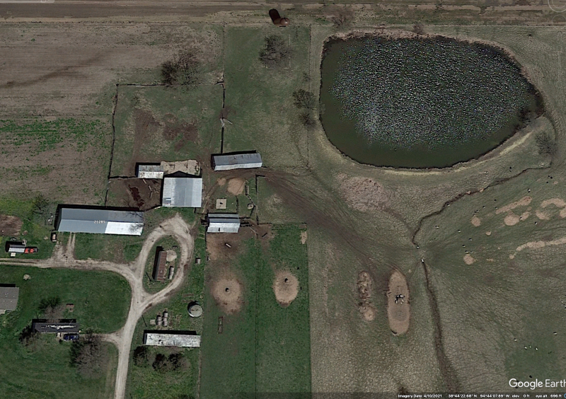 I was thinking about my first time fishing today, and thought I'd share the story. Like most of us, it was on a farm pond. But not just any farm pond... My great great great grandfather Samuel arrived in Johnson County, KS around 1868 and started an 80 acre farm. That farm stayed in the family through at least WWII, but then was sold. My uncle repurchased the farm in the 1960s and that's where I fished for the first time. I don't remember a lot about that trip or the fish, but I'm sure it was a little bluegill that I caught. We stayed there a few times, and us kids really loved it. Mom not so much. Here's a Google Earth of the farm and pond today: That square white building is the barn we all played in, and that was a ton of fun for us city kids. My uncle kept the farm for several years, but it was eventually sold. At some point the old farmhouse burned and now it's a hodgepodge of metal buildings. But the barn looks the same, except for having a little tilt to it. SO...what's the story on YOUR first fish?