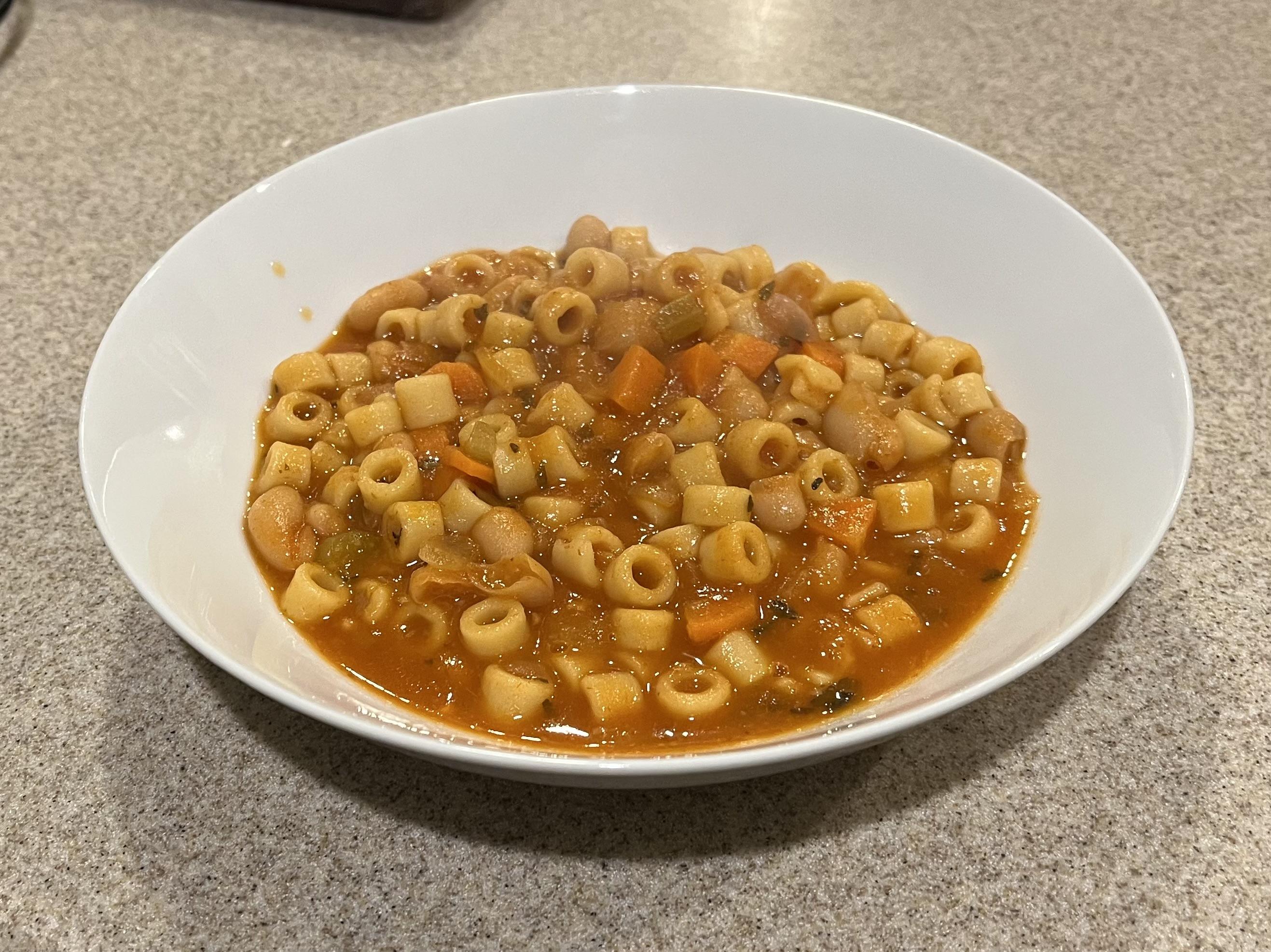 Talking about easy earlier...this veggie soup is that. 50-50 chicken broth and V8, some cabbage and whatever veggies we had around. Parsley, marjoram and red pepper flakes.