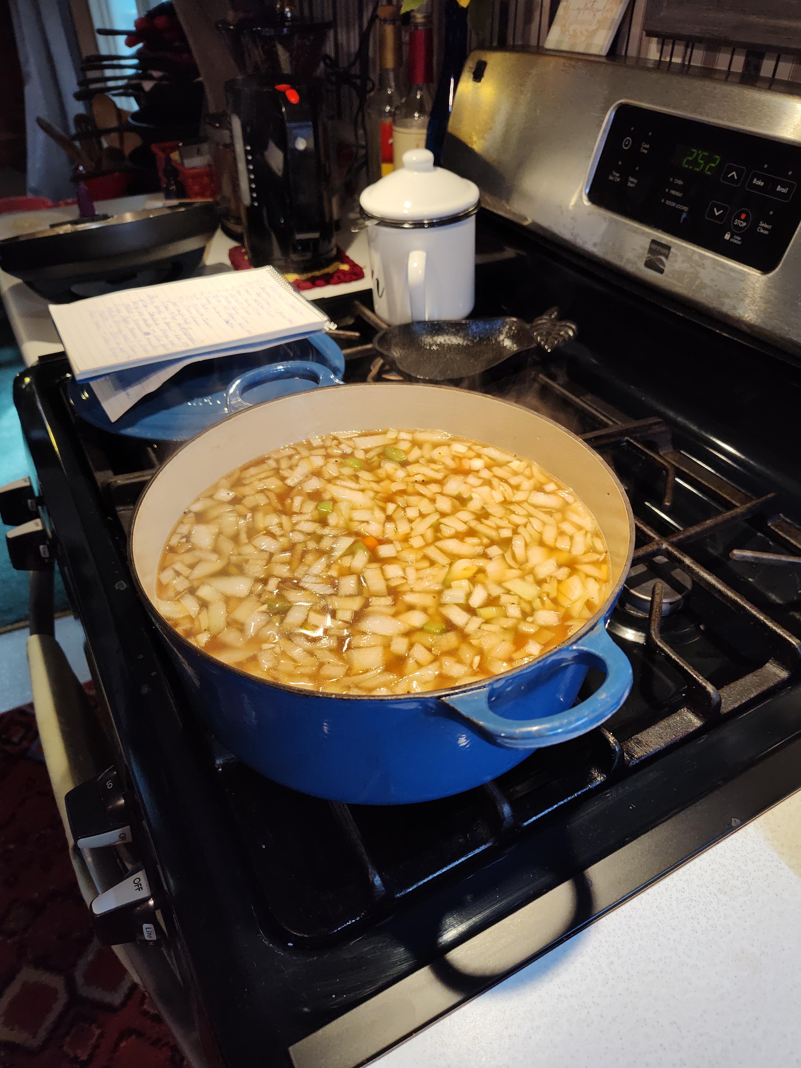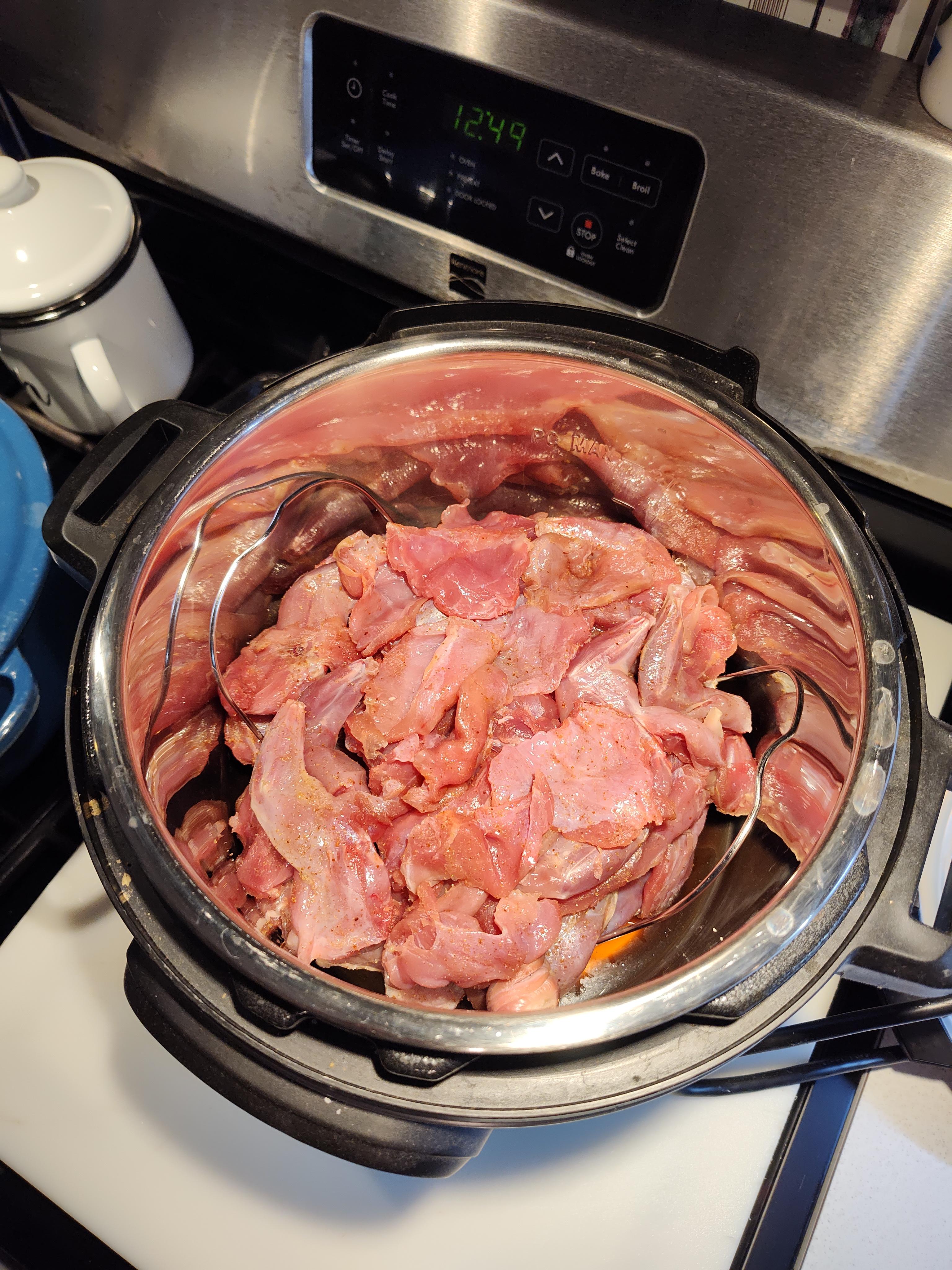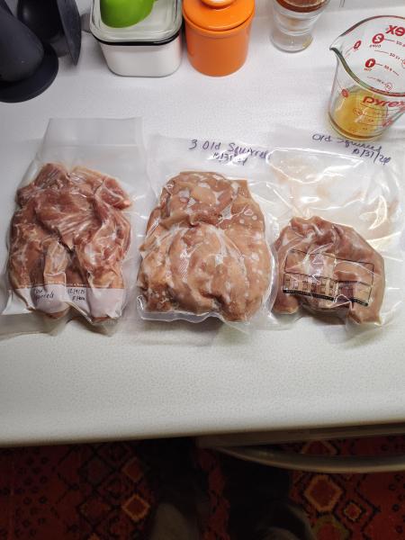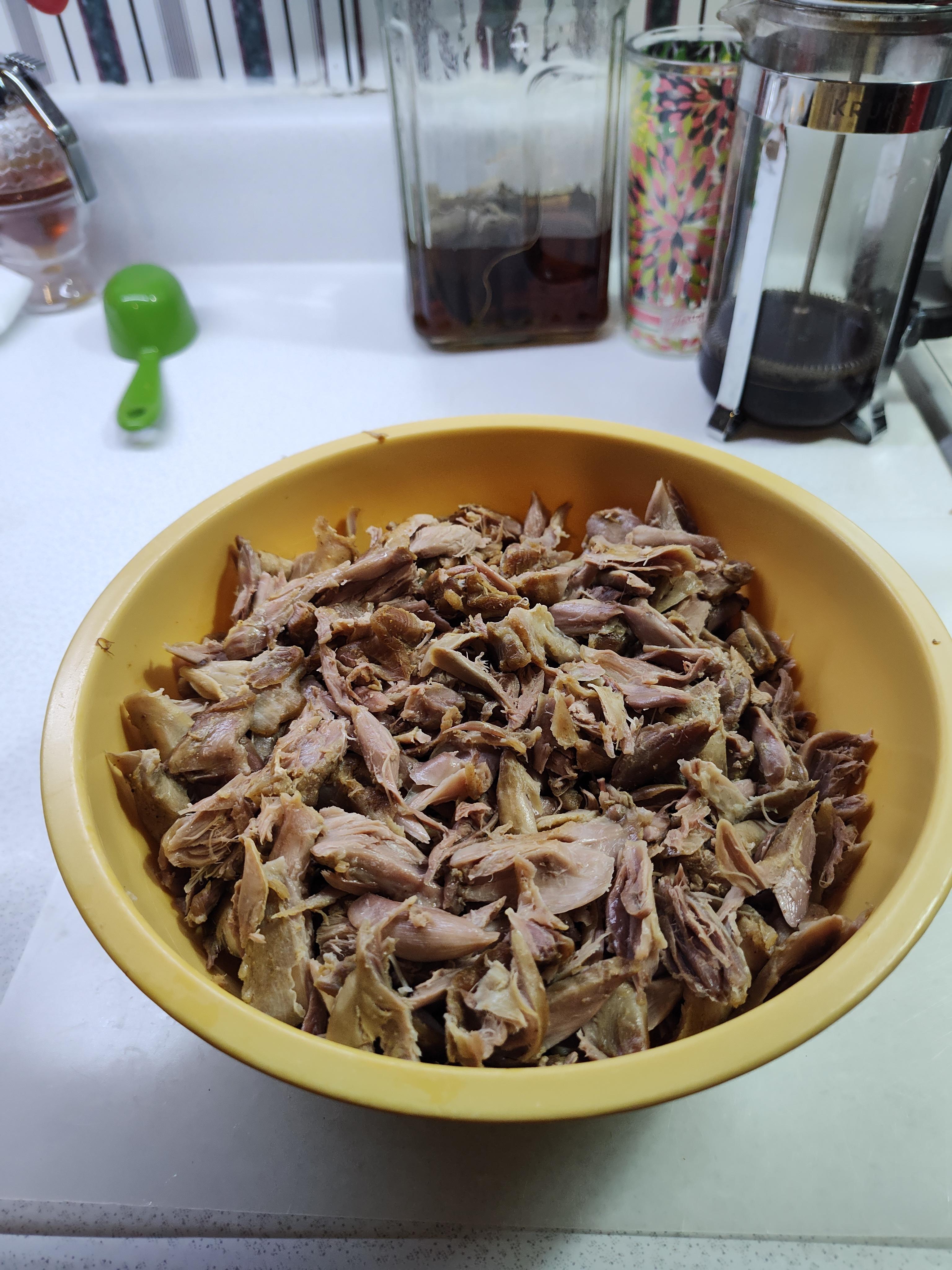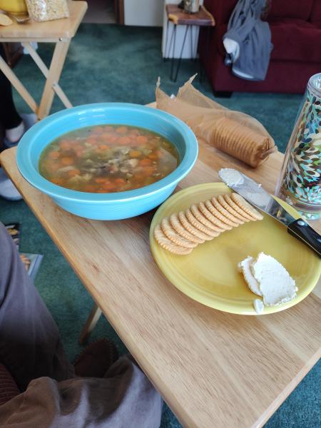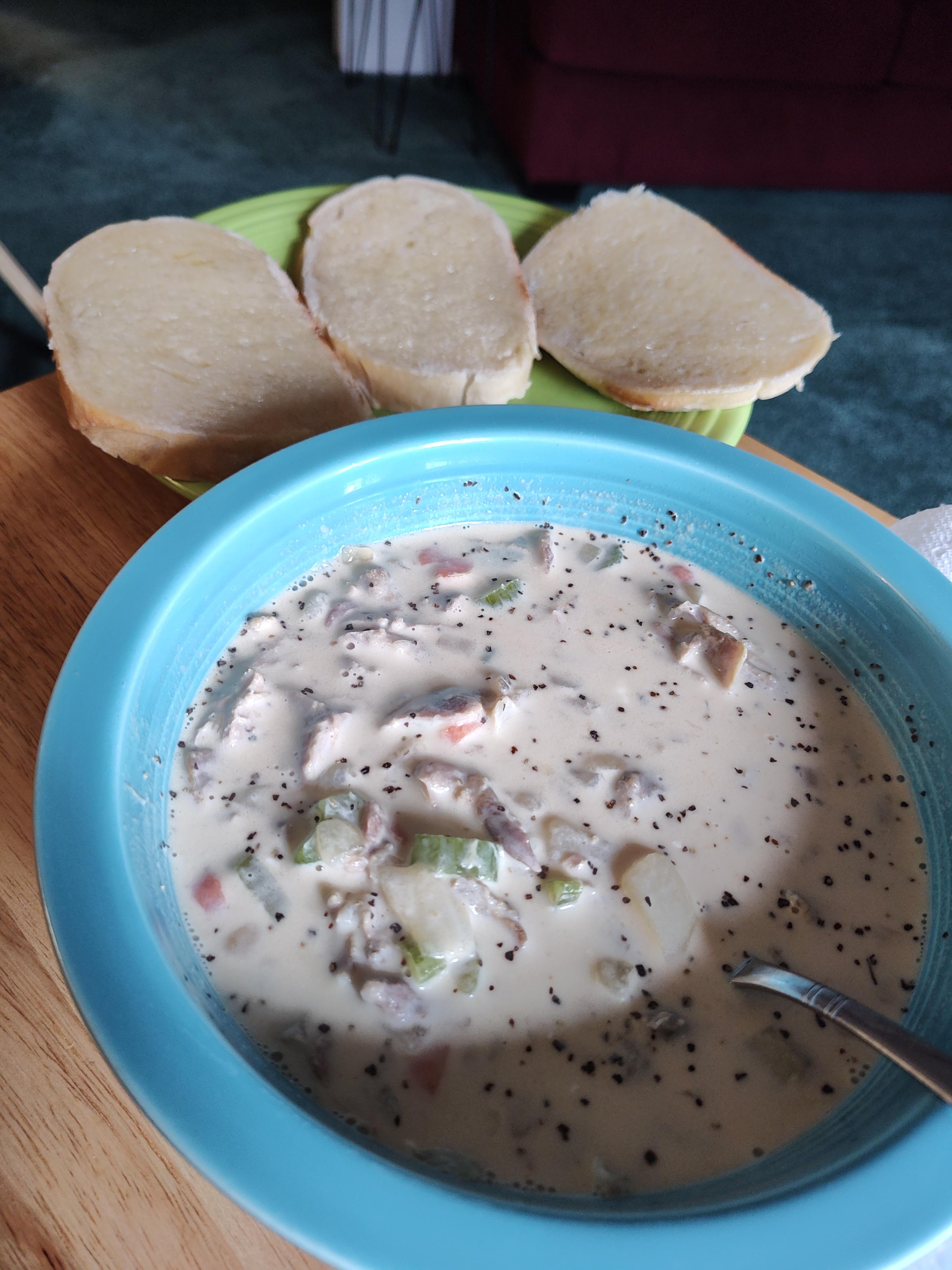 Our turn, Chowder the squirrel type. Eight big old tough guy were not any match against the insta pot. They gave up their tough guy attitude under pressure 😆. The eight picked a nice bunch of meat. While I picked Pat did the veggies and other stuff. Finished and assisted with buttered hot sourdough. Life is going good in hibernation mode.