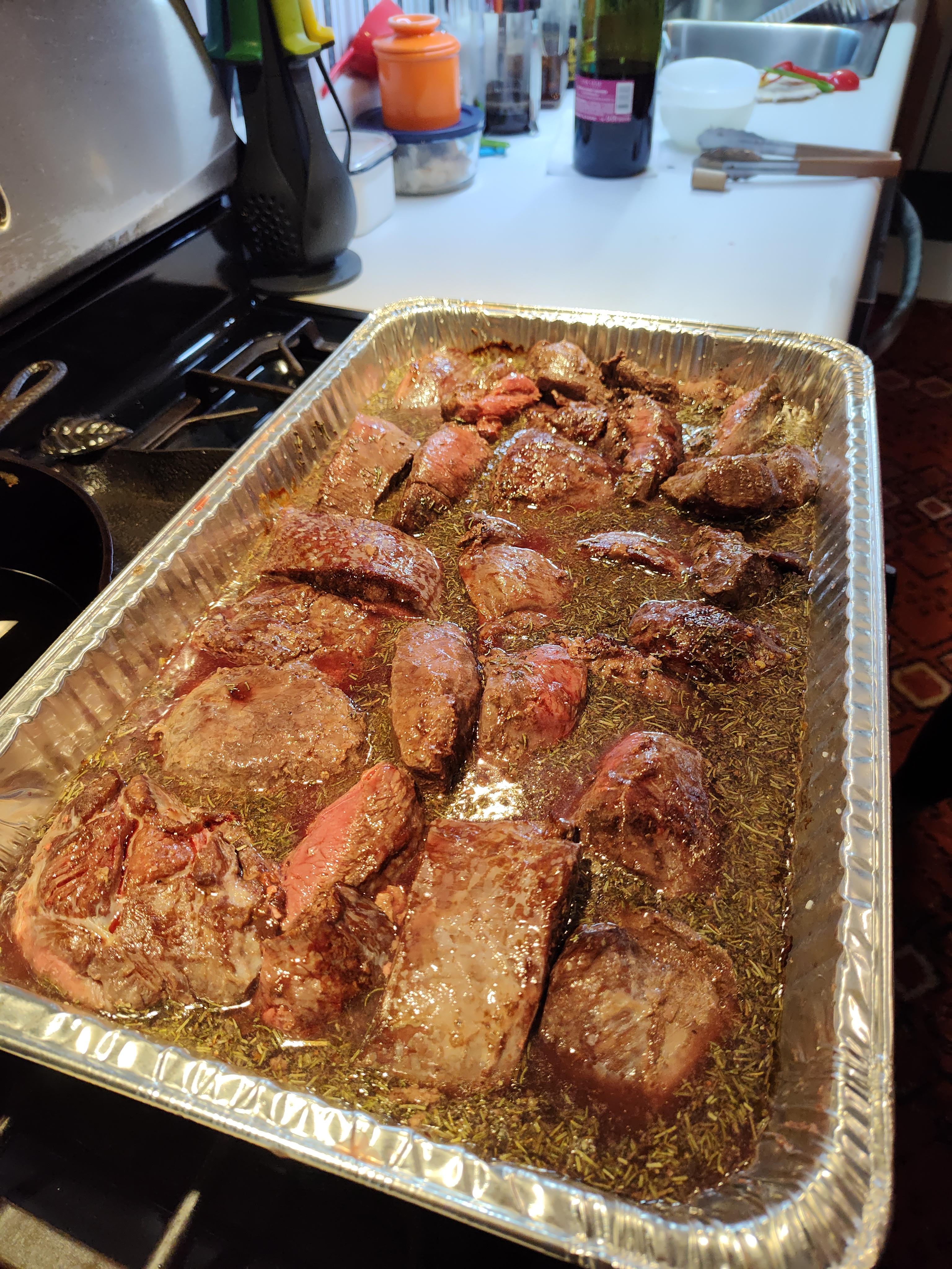 Browned venison roast in red wine and spices and herbs ready for a long braise. This will be taneyfest food.