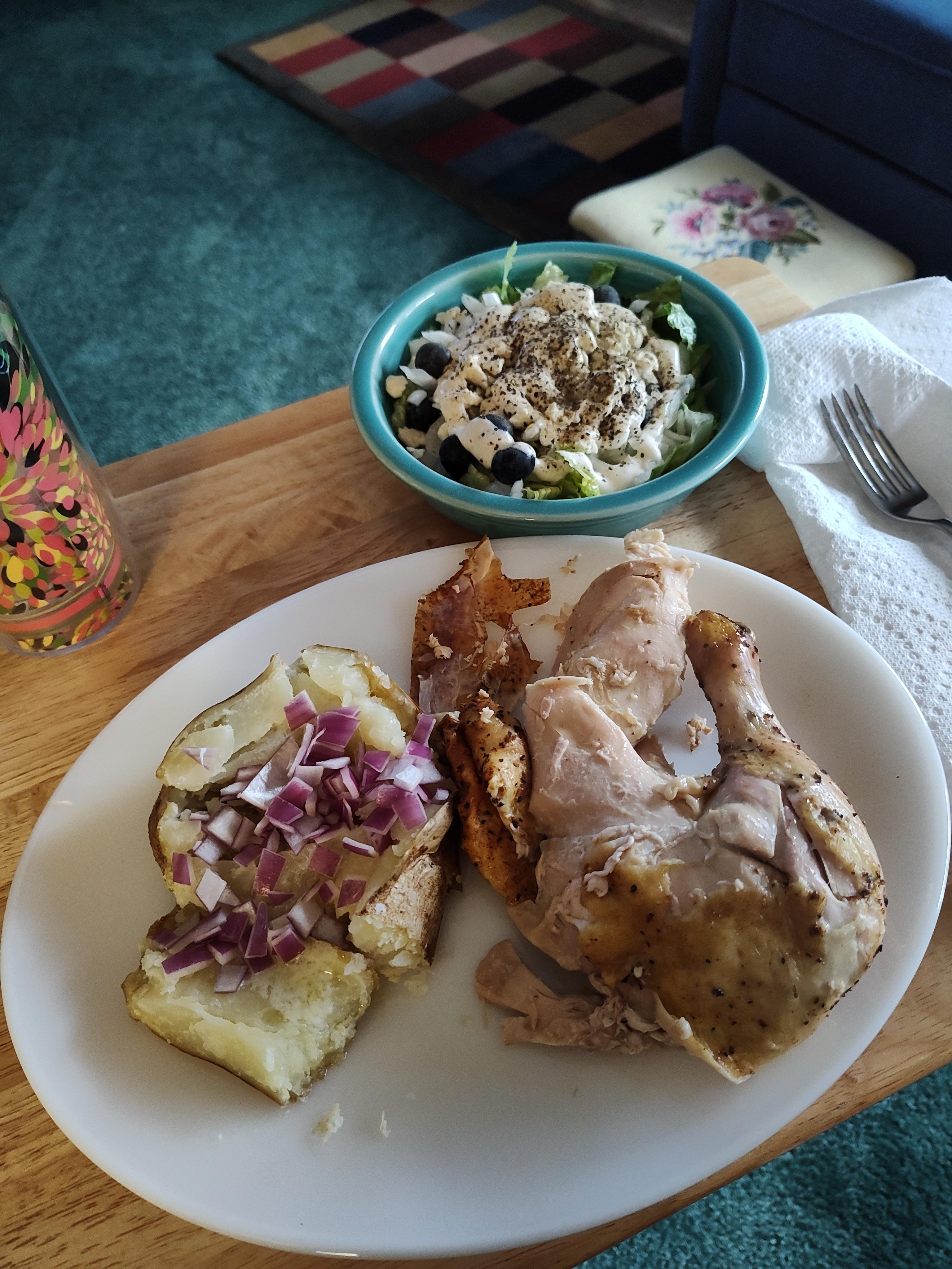 Grilled bass over charcoal and crabapple wood last Saturday Sunday fried crappie and fried onion petals. Trager baked potato and a salad.