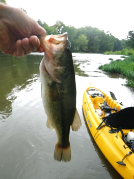 I floated down the river for the first time this year. I thought I would clean up the kayak before I took her out. She"s about 10 years old and the yellow is fading so I bought a bottle of 303 Protectant , it did a great job. I dont know what the life expectancy for a kayak is but she looks like she could last for another 10 years. Great weather but the river was up a little, for me. The good news was on the way out of the house I checked my list and almost forgot my camera. The bad news was the last time I charged it up was last year, so I was only able to take 3 pictures. The google-eye were out and hungry so I caught a mess of them. Caught a few smallmouth, only one nice one and I didnt see any nest. After I took its picture my camera stopped working so the rest of my story I have no pictures. The longest fish I caught was about 3 ft., It was a Gar. I fought it for a few minutes, surprised it didnt throw the lure, which was a deep diving crank. I was on the bank at the time so I decided to walk it up on the bank. The lure was just barely hanging in its mouth so I dropped my rod and jumped over and straddled it on my knees, hoping to land it. But it just threw the lure and slipped through my knees. The camera was dead so I couldnt take a picture anyway. Released them all.....great day on the river...looking forward to a great year on the river....
