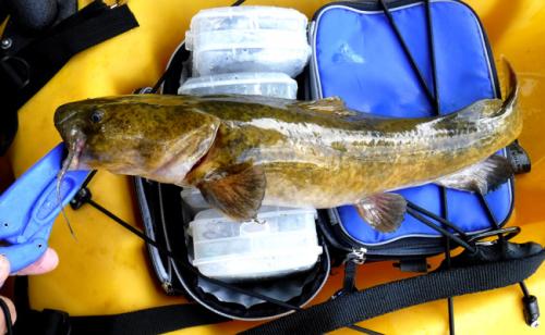 I got out on the river the other day, a less than average day. What you might call a slow day. It rained on me for about an hour. It was one of those days when you dig deep in the tackle box and start fishing with lures that haven't touched the water yet. I didn't catch any thing big or very many but I always enjoy the float. I did have two first...caught a fish on a bright red craw colored crankbait, I've never used red, and caught my first flathead. It just so happened they both happened at the same time. The good new is Alice is sea, river, worthy again. So for anyone who has a hole in your HDPE kayak and can't plastic weld it, the answer is G/FLEX, thanks Flysmallie. I thought I would post pics of where the hole was, inside the scupper hole and the flathead. Released them all, Great day on the river...... This post has been promoted to an article