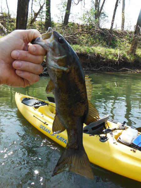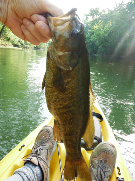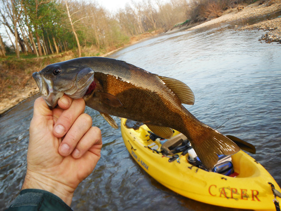 Yesterday, I got the kayak out for the first time this year. I had great weather for my float.. Caught a mess of smallmouth out of the deep holes and a mess of goggle eyes. Thought I would post a couple of pictures and a couple of the largest smallmouth I caught. I dont know how big it was, so when I got home I layed a ruler acrossed my legs to see how long it was. I could not hold it out in front on me, with one hand, to take a picture because my arm was not long enought to get the whole fish in. With my light rod, it was all I could do to pull her in. Caught and Released them all. I also tried out a couple of lures I bought on E Bay from China. They will not be making any more trips down the river. They looked nice but...All in all a great day on the river.