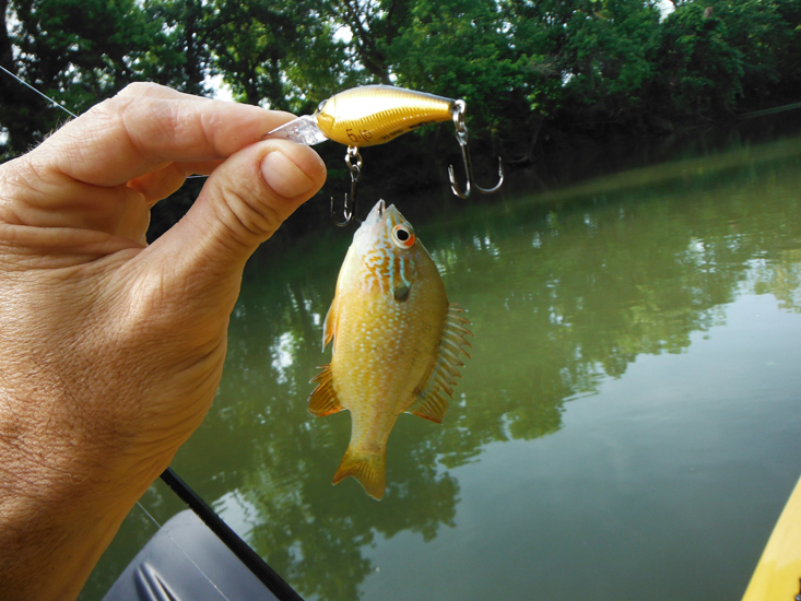 Kayaked down the James Friday, great day to be on the river. I didn't have any luck with topwater early in the morning and my swimbaits were catching goggle-eyes. They wanted something crunchy so I started throwing crankbaits. My first catch of the day was a catfish, which was a good way to start off. Caught a lot of goggle-eyes and small bass. On one of the lures that was working for me, I broke off one of the hooks, but since I was catching fish with it, I keep using it and keep catching fish. I lost 4 fish by them jumping out of the water and throwing the lure. I had bought a Scatter Rap at BP so I thought I would try it out. One of the larger fish of the day was caught on it, in about 2 ft of water. The Scatter Rap runs 6 to 9 feet deep. So my question: I was using a crankbait the runs 3 ft deep for water 3 ft deep and changing when I got to deeper water, knowing that I wanted it to bounce off of structure. So should I just fish deeper running crankbaits as long as I'm not getting hung up on the bottom, no matter how deep the water is? In the James, fish with a crankbait the run 6 to 9 ft deep all the time and if I need it to go shallower fish it slower? Just trying to improve my fishing knowledge. Took pictures of a few and Released them all to fight another day.