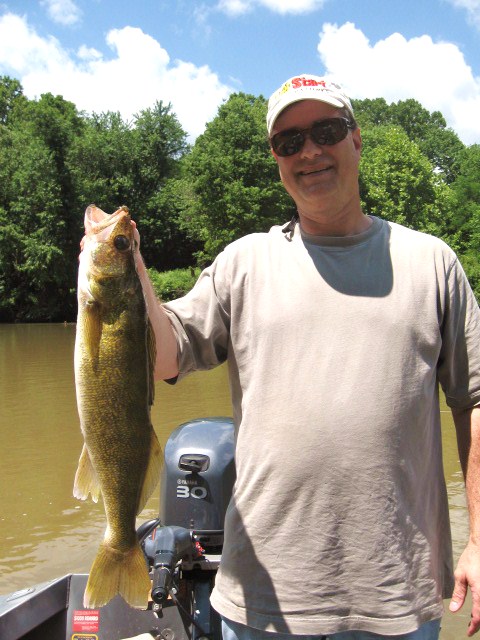 zipstick Posted June 17, 2010 Posted June 17, 2010 In the heat of summer these high, muddy conditions on streams really take the starch out of good fishing usually. Today was no exception as the bass were just tough to catch. The river both rose several inches and fell even more over the last 24 hours after another hard rain while the visibility diminished to about 8 inches. We should have traveled farther upstream perhaps. Anyway, we spinnerbaited and jigged and wormed, and began to realize that the orange bellied crankbait, particularly the Wiggle Wart proved to be the best for us to catch a few biters. Most bass were hooked outside the mouth, and we struggled to put together a decent pattern, but Mitch did get a bragging sized walleye on the Wart around noon on a rocky bank with current nearby. In spite of the tough conditions, we managed to make a day of it. With this heat, I'm counting down the days to Brr suit weather!