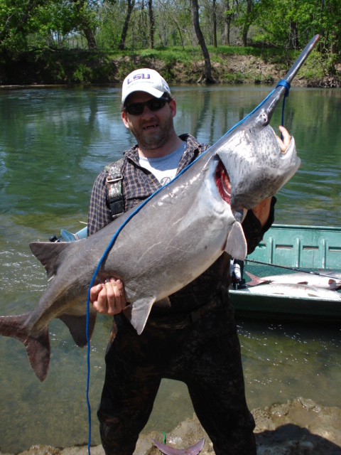 Seth Posted March 8, 2011 Posted March 8, 2011 Two year old pic Seth from the Honey Hole. That one was 96er. Last year my son lost one at Walnut Springs while I was videoing him. That fish was well over 100lbs. When I went to gaff him the rubber nipple was still on the end of the gaff. She got too close to the motor and cut the line. I would post the video...HOWEVER, I cant figure out how to edit the curse words he let out....my fault. His biggest last year was 85lbs and Robert and I had some 75lbrs. Man we catch a BUNCH of paddlefish and have yet to catch anything over 85 that I know of for sure. I'd love to catch a triple digit fish one of these days. As for your video, if you want I can work on editing the cuss words for you. I'd love to see it!