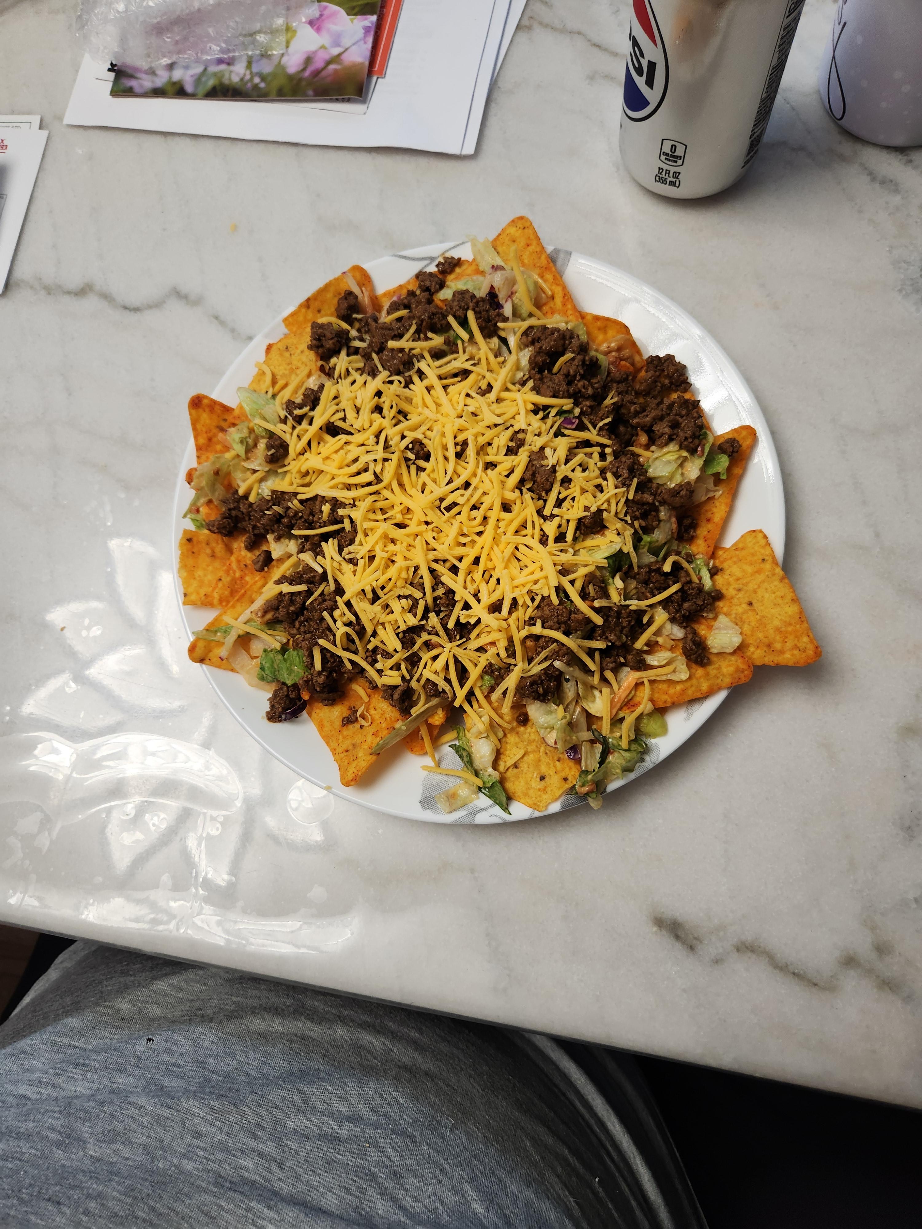 Daryk Campbell Sr Posted April 7 Posted April 7 Lately, dinners have been very repetitive or simple. Last night was nearly the same. But ive been needing something to post, @nessgave the nudge, so.... I present nacho salad plates. Base layer of chips of your choice. Wife wanted Doritos, I had Tostitos rounds. Next layer was a bagged taco salad from Walmart. Then taco meat, cheese, and whatever extras you prefer. Turned out really good, but I forgot black olives. nomolites, ness, Flysmallie and 1 other 4 Money is just ink and paper, worthless until it switches hands, and worthless again until the next transaction. (me) I am the master of my unspoken words, and the slave to those that should have remained unsaid. (unknown)