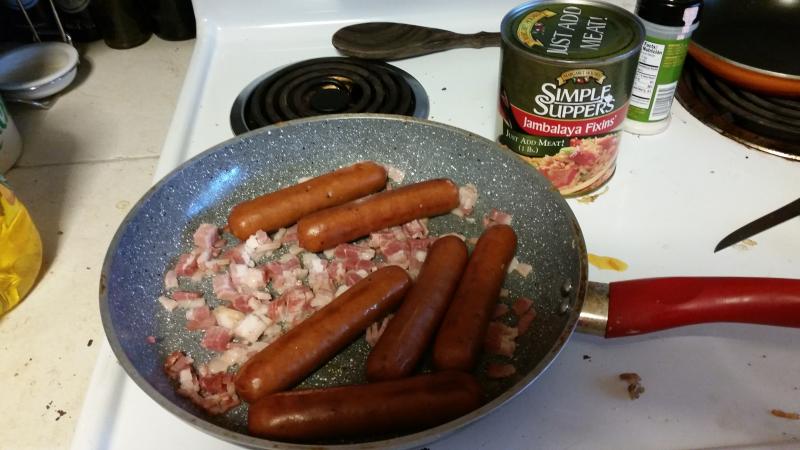 MOPanfisher Posted September 17, 2016 Posted September 17, 2016 Tonight's hillbilly supper. 6 Applewood and cheese smoked brats, rolled around in a hot skillet, 3 slices of diced up old bacon I found in the freezer. Sliced up 4 of the six brats, added them back to the skillet, deglazed the skillet with some room temp tap water that was in a glass by the sink, added the can of "instant jambalaya", poof supper is served. Now I am not going to tell you all that it is gonna be as good as RPS's mussels and soft shelled crab, or anyone's smoker product, but it probably closer to reality for most of us. There are a few small things most wouldn't things of, like using only 4 of the 6 brats, just in case it is terrible, you don't have to eat a raw hot dog for supper. Chief Grey Bear, Gavin, rps and 2 others 5