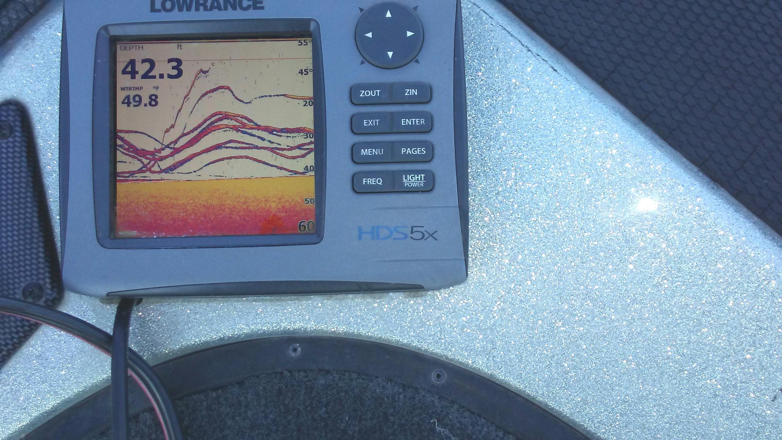 Dock-in-it Posted December 19, 2019 Posted December 19, 2019 I fished a while this morning and the deep bite is still good but it takes a lot of searching with the big motor and trolling motor. The shad are normally stacked when you find them and they might be thick for several hundred yards. I do not see very many fish relating to stacked shad. I normally find the shad then use both the big motor and trolling motor to search the edges for active fish. The shad are normally in the channel and I move to the shallow edges (normally 38-55ft). Caught fish this morning on a 4" smoke grub, Damiki rig, and 5/8 ice jig. The WT is about 50-51. The graph picture below shows no shad around the fish, but the shad were very thick about 60ft away. Had about 12 keepers and plenty of shorts. magicwormman, Quillback, merc1997 Bo and 3 others 6