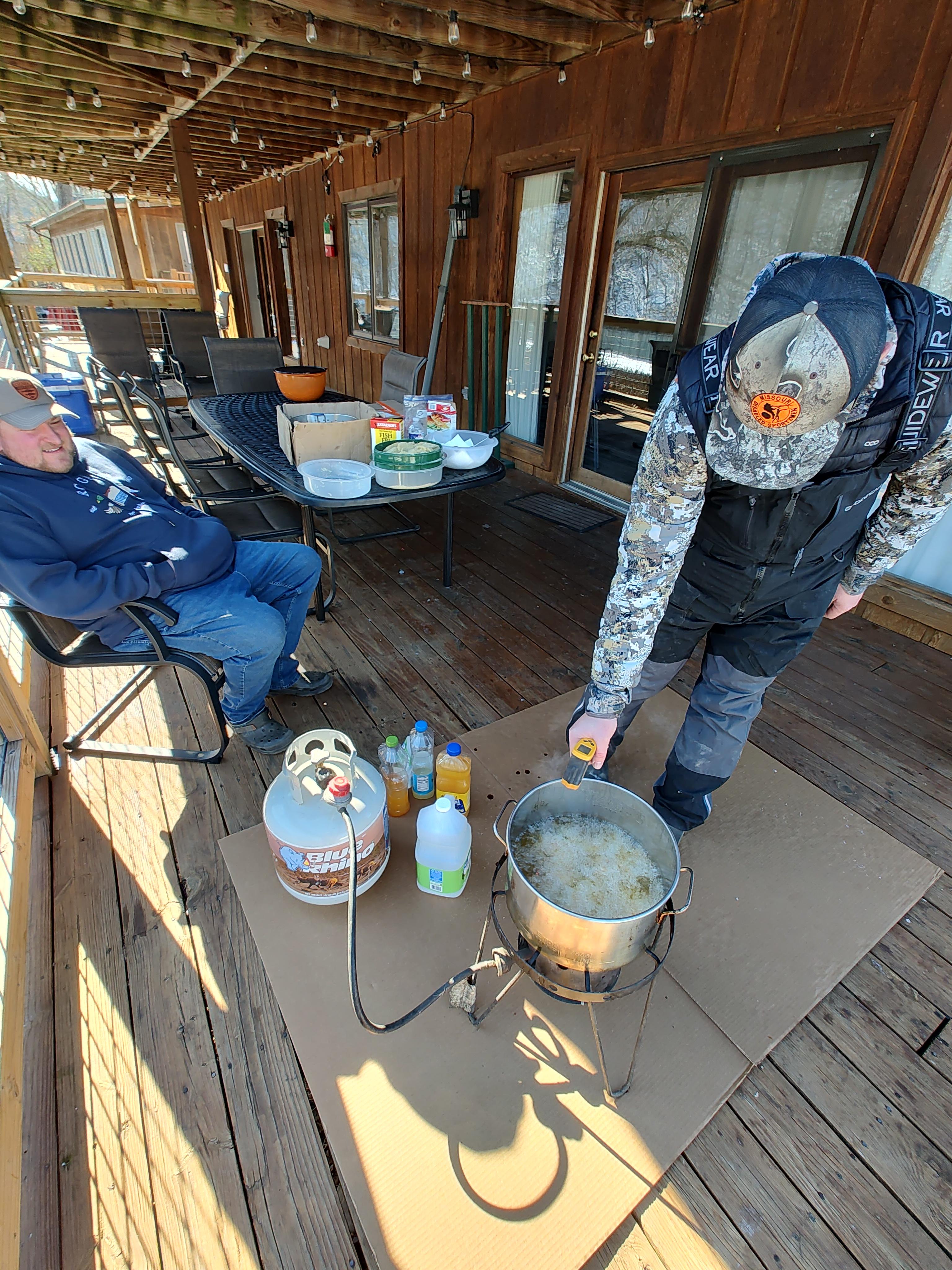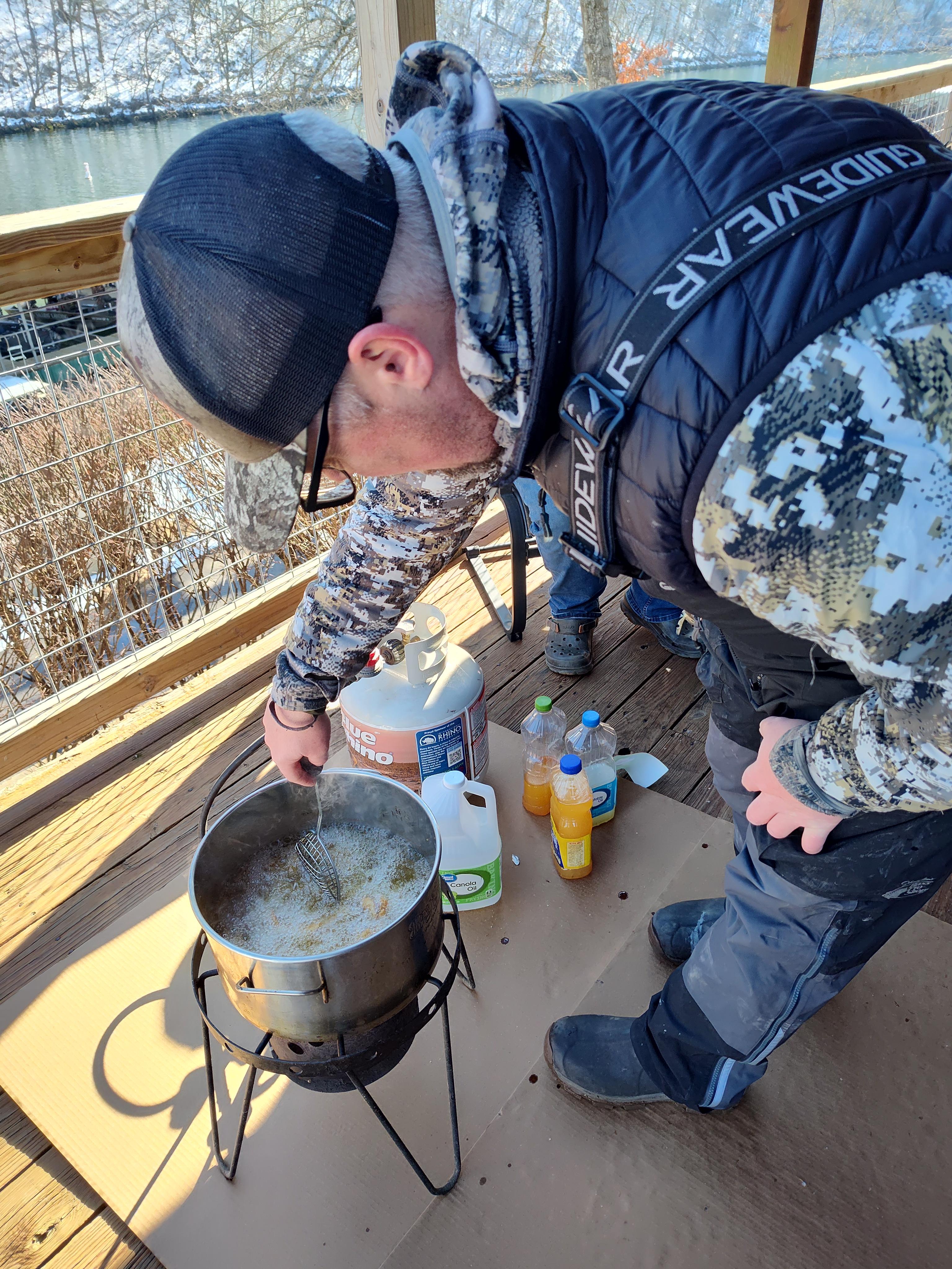 BilletHead Posted 22 hours ago Posted 22 hours ago In between all this eating was some fishing. With all the threadfin shad going through the turbines running on peak electric demand the bite on white was off the charts catching rainbow and browns that when being unhooked and released were puking out shad. Some so packed you could see shad protruding out of their gullets into the mouth. Each morning trip and evening trips the brave Anglers came back with wind burned faces and cold fingers but great stories. Pat and I did not fish this trip giving it up to the younger ones. There was a 20 buck each pool for the biggest fish. I'm not sure of the winner but someone came up with a three way tie.😐. This brought us to day three Saturday morning. More breakfast of sausage and package sausage gravy with more eggs and bacon. We missed that but got in on some crispy cold bacon. More fishing and then the afternoon big meal where Michael's wife, mother ,daughter and her fiance were to eat with all. Seth got his cooker fired up and into the hot oil crappie fillets we released for a quick swim. Then thin cut potatoes and onions that Grizwilson had prepared. It was a rotation of crappie, potatoes, hush puppies and wild turkey. Over and over until all had a swim in the hot oil. Coleslaw too. Everyone got full and then desserts were put out. There wasn't much leftovers. After this there was the tribute to Michael one of our OAF comrades. We all miss you friend. Just about all of the jigfest and taneyfest tribe have spent time with Michael fishing here or there. He was the first person I had in my boat at my first jigfest. I also got to spend even more time with him fishing the spring River in Oklahoma for the white bass run. Lots of conversations and fish catching. Ryan Miloshewski, grizwilson, Johnsfolly and 5 others 8 "We have met the enemy and it is us", Pogo If you compete with your fellow anglers, you become their competitor, If you help them you become their friend" Lefty Kreh " Never display your knowledge, you only share it" Lefty Kreh "Eat more bass and there will be more room for walleye to grow!" BilletHead " One thing in life is for sure. If you are careful you can straddle the barbed wire fence but make one mistake and you will be hurting" BilletHead P.S. "May your fences be short or hope you have long legs" BilletHead