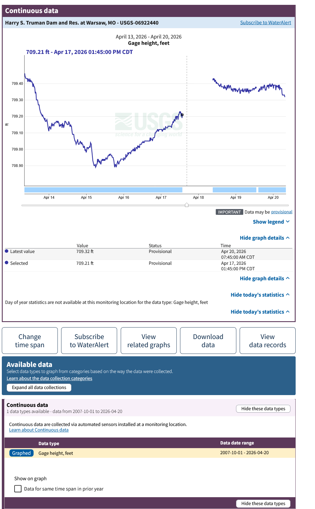 tjm Posted yesterday at 01:33 PM Posted yesterday at 01:33 PM current USGS page shows no data for the 18th when the anomaly occurred with level of 709.32 https://waterdata.usgs.gov/monitoring-location/USGS-06922440/#dataTypeId=continuous-00065-0&period=P7D&showFieldMeasurements=true